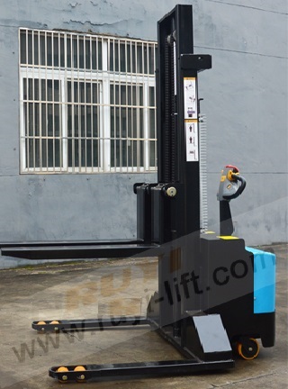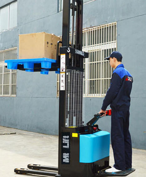 Electric Stacker by Mountain Lift All Electric Stackers by Mountain Lift come with power charger suitable for USA standard 120V/60hz electrical outlets, and one year warranty on parts. Our electric stacker provides easy maneuverability without having to running to the gas station for fuel, and with its foldable stand-on platform and wide forks (shown below) it moves standard pallets in variety of sizes safely and efficiently. Pricing
